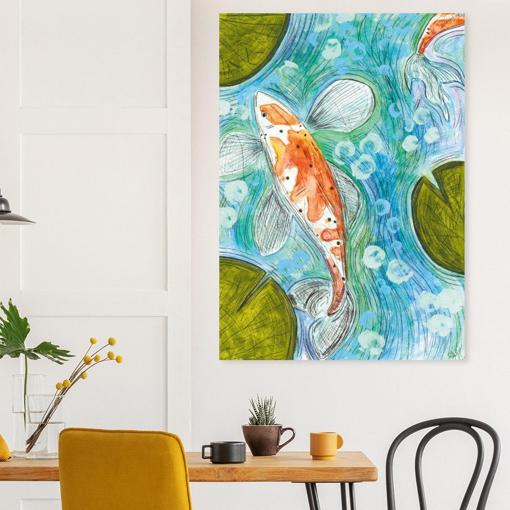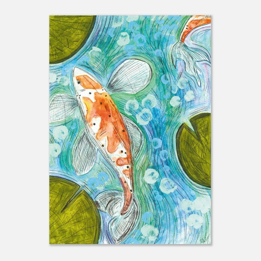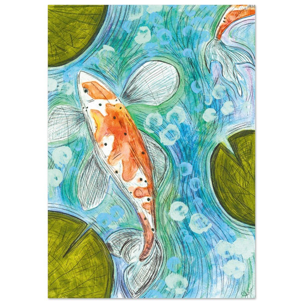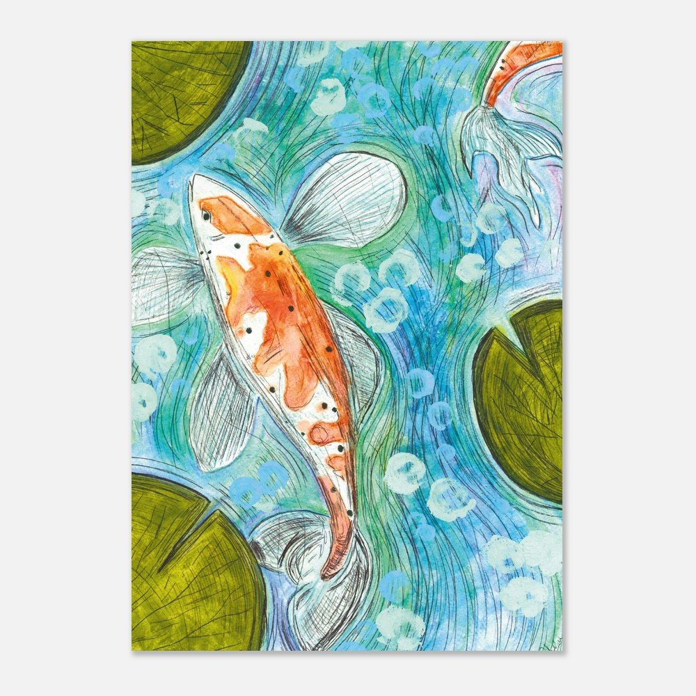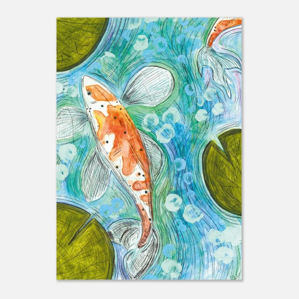 A print of original watercolour pencil and ink illustration 'A Little Koi' by Sarah Hutchinson-Jarman. Printed on 200gsm sustainable matte paper with a luxuriously soft finish. Choose paper size at checkout.