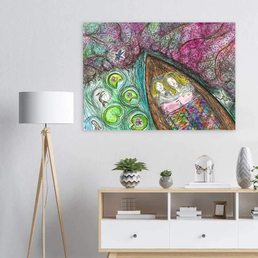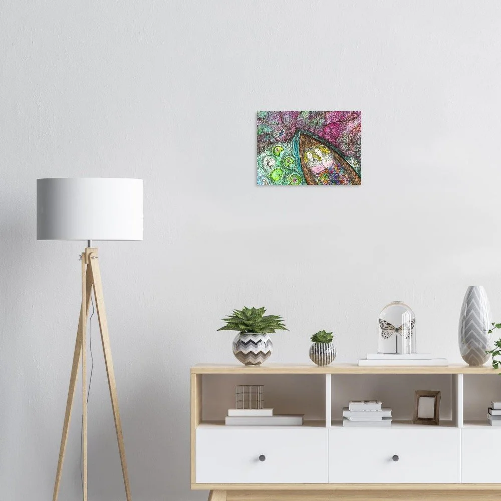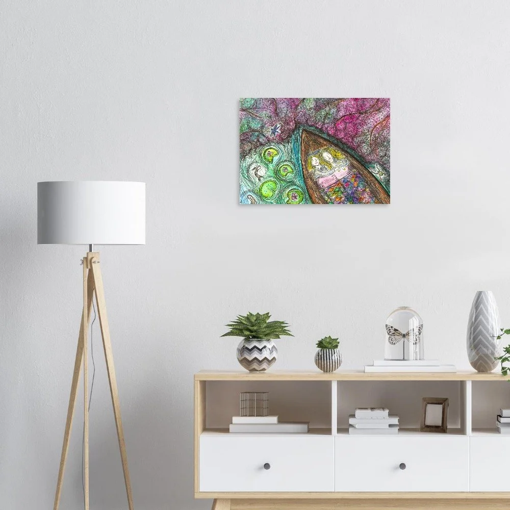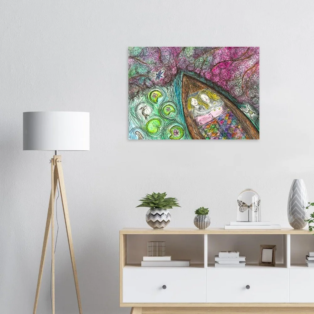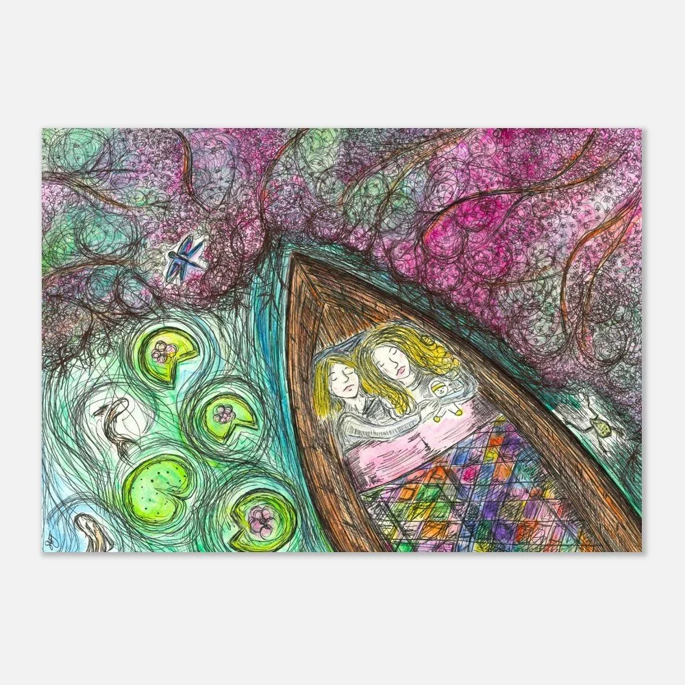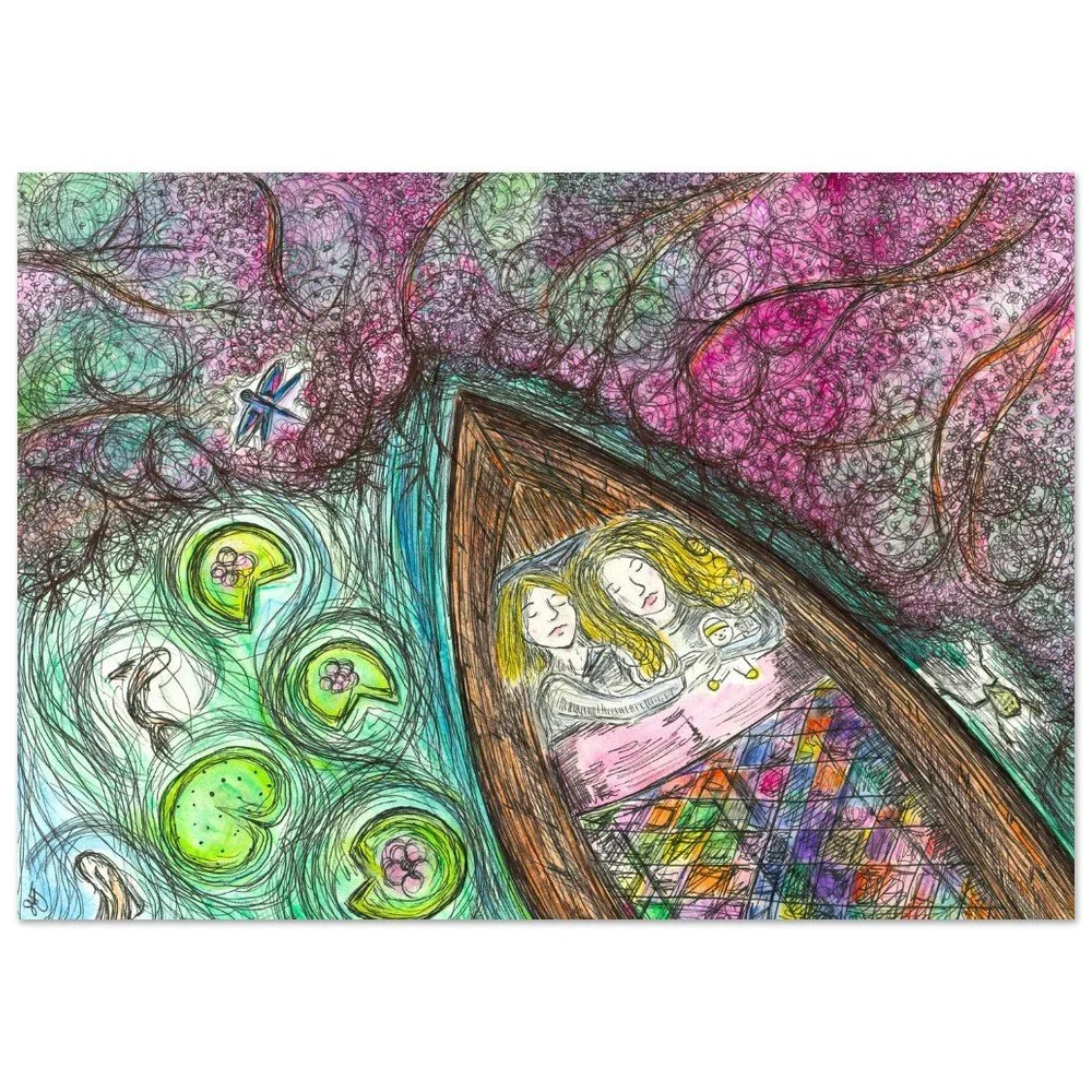 Every night, during bedtime stories, Sarah and her daughter pretend they are floating down a beautiful river in summertime. This new print is inspired by those adventures. A print of an original watercolour pencil and ink illustration. Printed on premium 200gsm matte paper with a luxuriously soft finish.