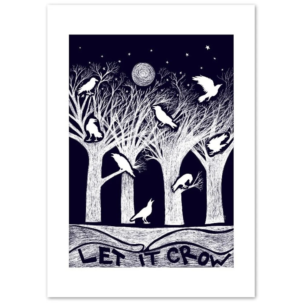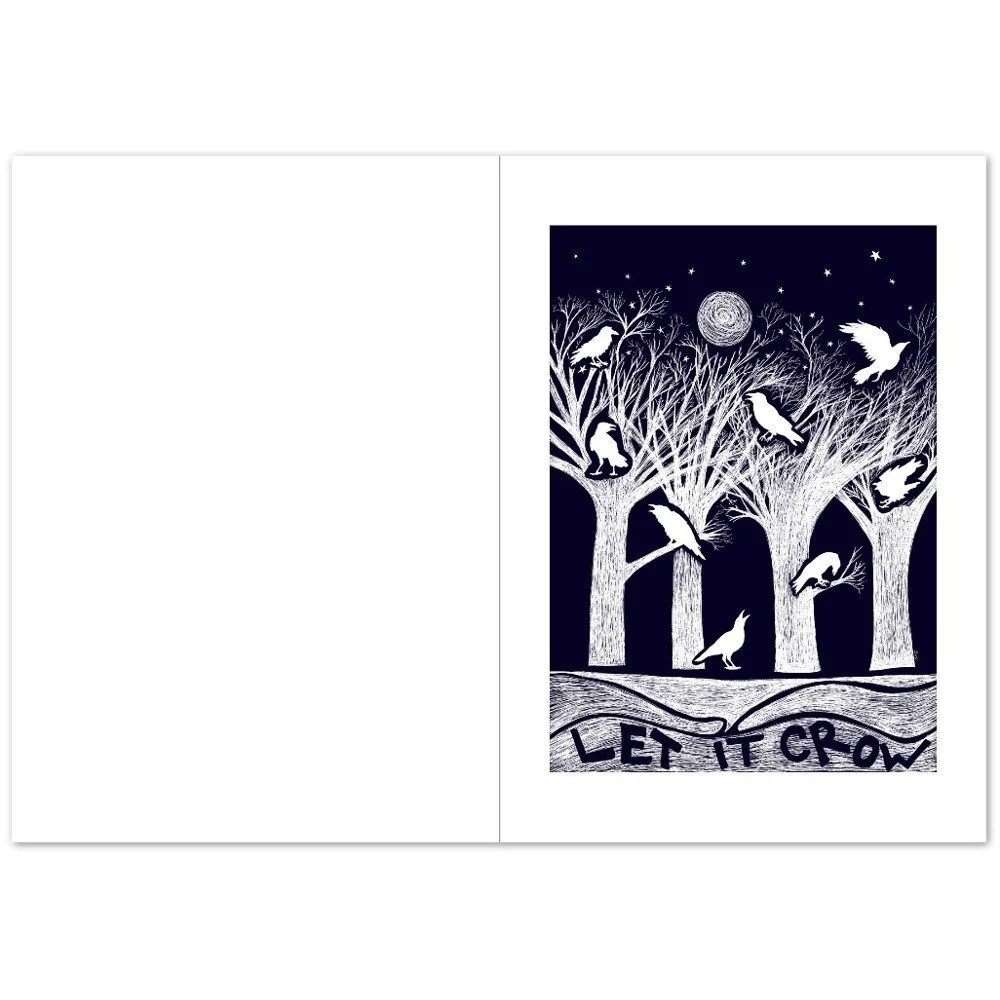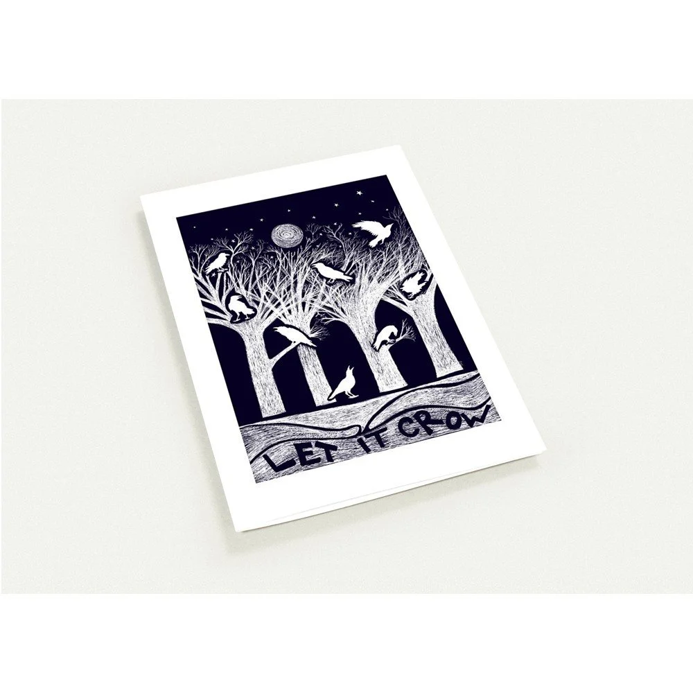 Inspired by a winter's night in the woods, Let it Crow is an original illustration by Sarah Hutchinson-Jarman. Printed as a set of ten greetings cards on durable 300gsm sustainable matte paper.