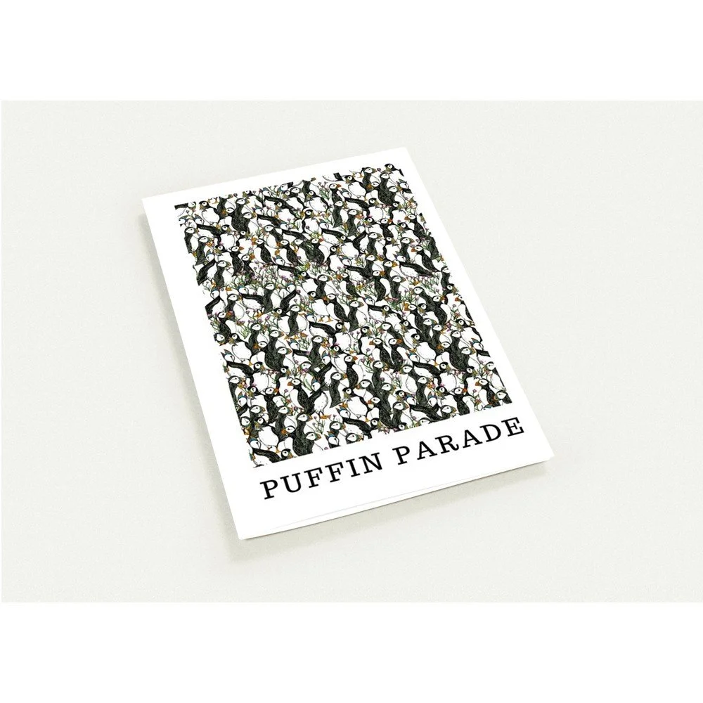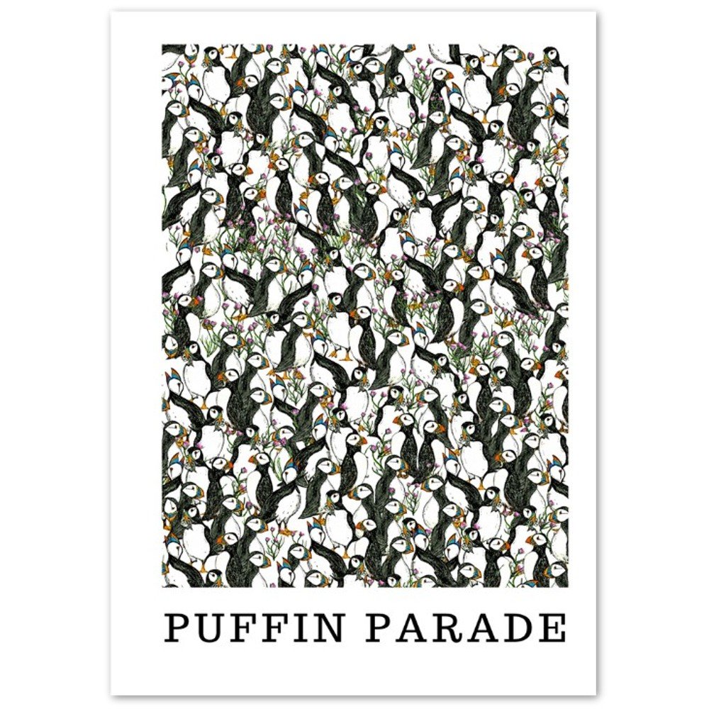 Puffin Parade is a watercolour pencil and ink original illustration by Sarah Hutchinson-Jarman and was created to highlight the falling number of puffins in the Purbecks. Printed as a set of ten greetings cards on durable 300gsm sustainable matte paper.